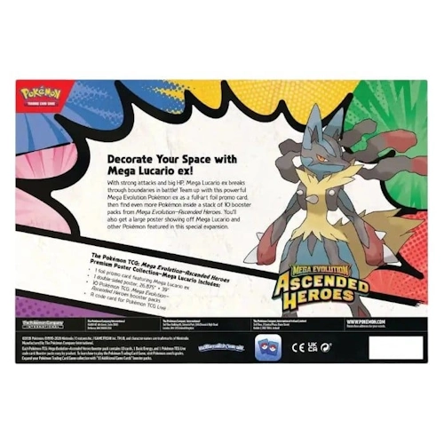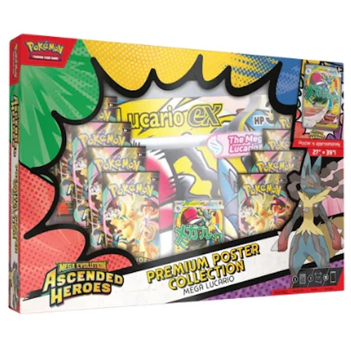 Bewonder de geweldige Ascended Heroes Premium Poster Collection Mega Lucario wanneer Mega Dragonite ex het luchtruim kiest en een verzameling Pokémon van topniveau aanvoert in de strijd! Trainer Pokémon en Stellar Tera Pokémon ex sluiten zich aan bij terugkerende en nieuw ontdekte Mega Evolution Pokémon ex, waaronder enkele met speciale illustraties die hun grootste en meest indrukwekkende aanvallen laten zien. Vier de sterren van Scarlet & Violet en het aanbreken van Mega Evolutie.